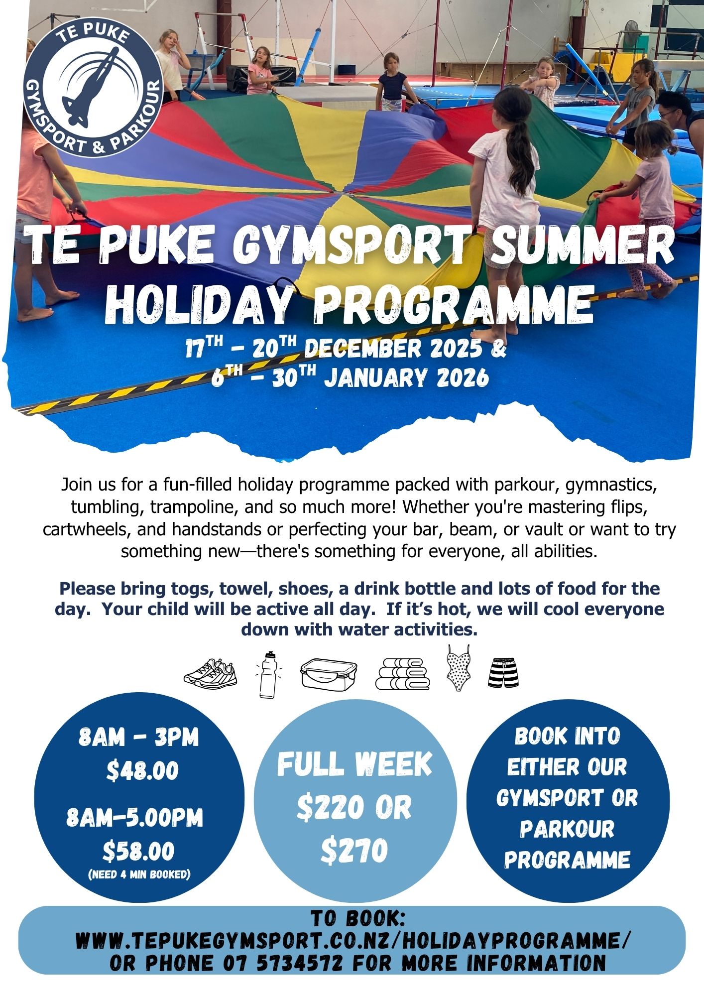 Any questions please call on 07 573 4572 or email office@tepukegymsport.co.nz