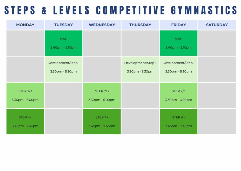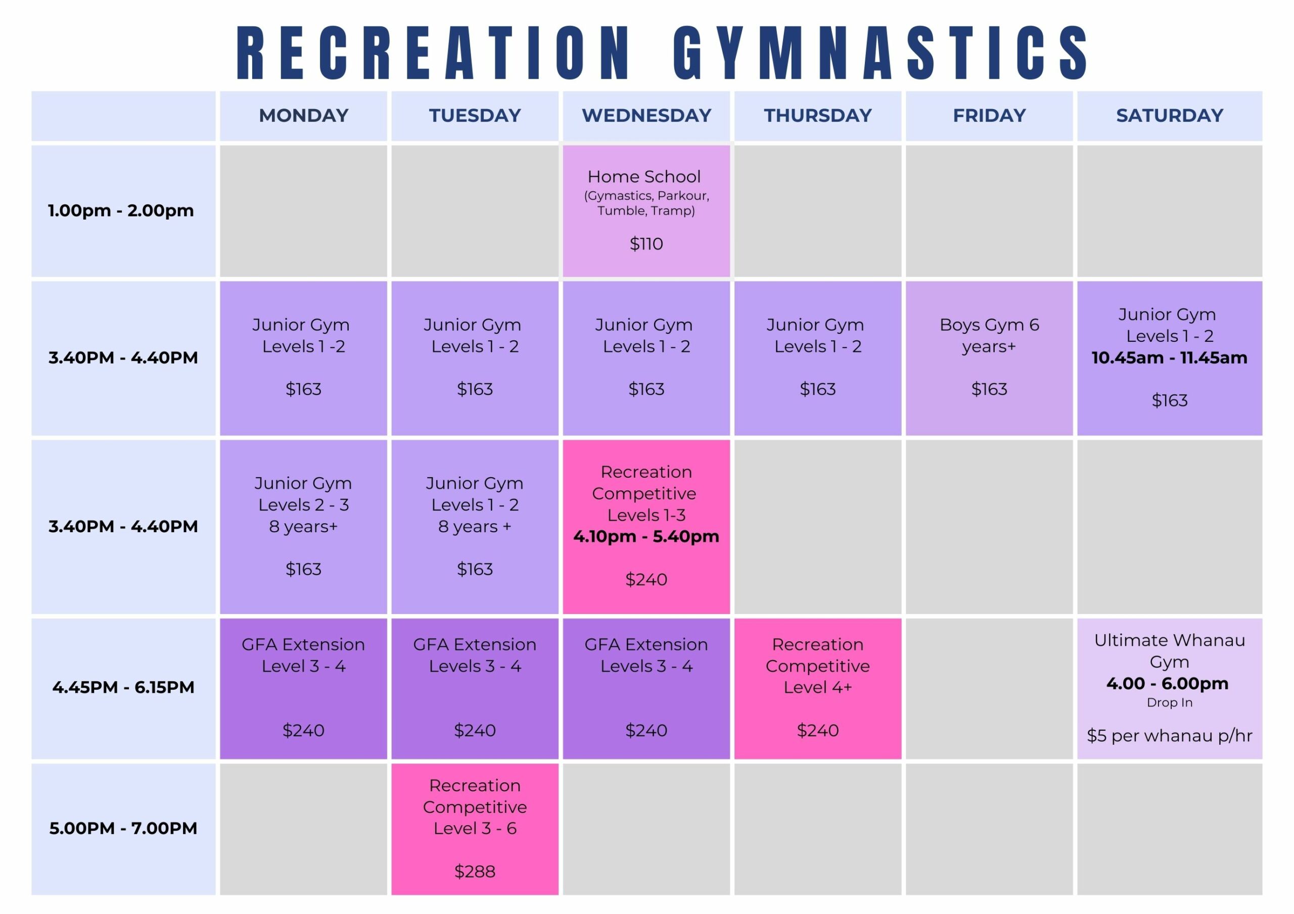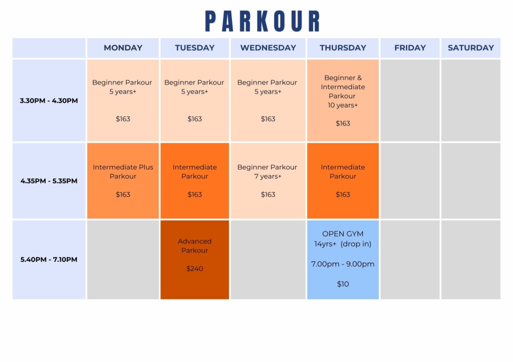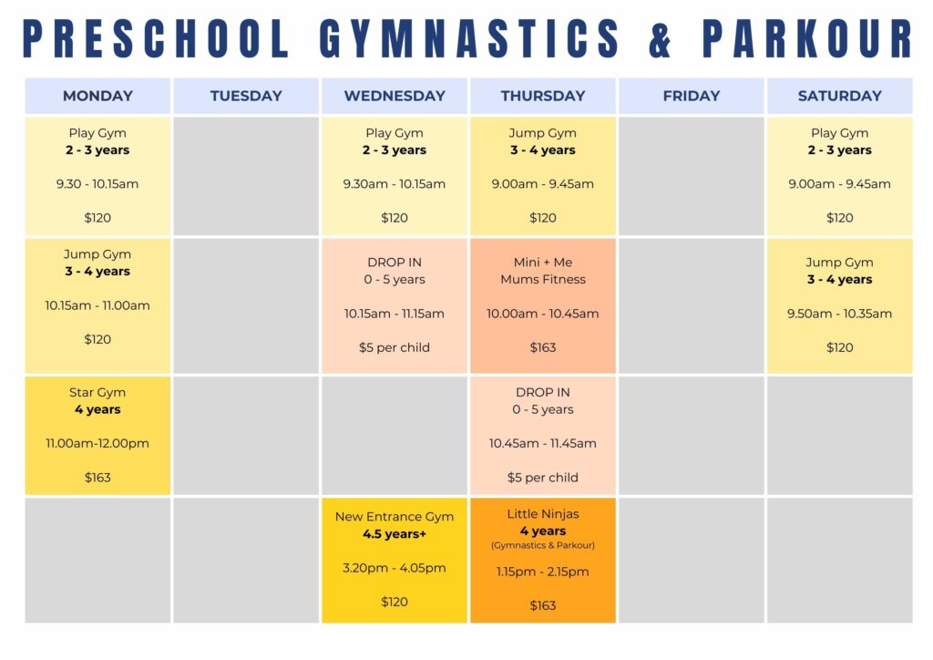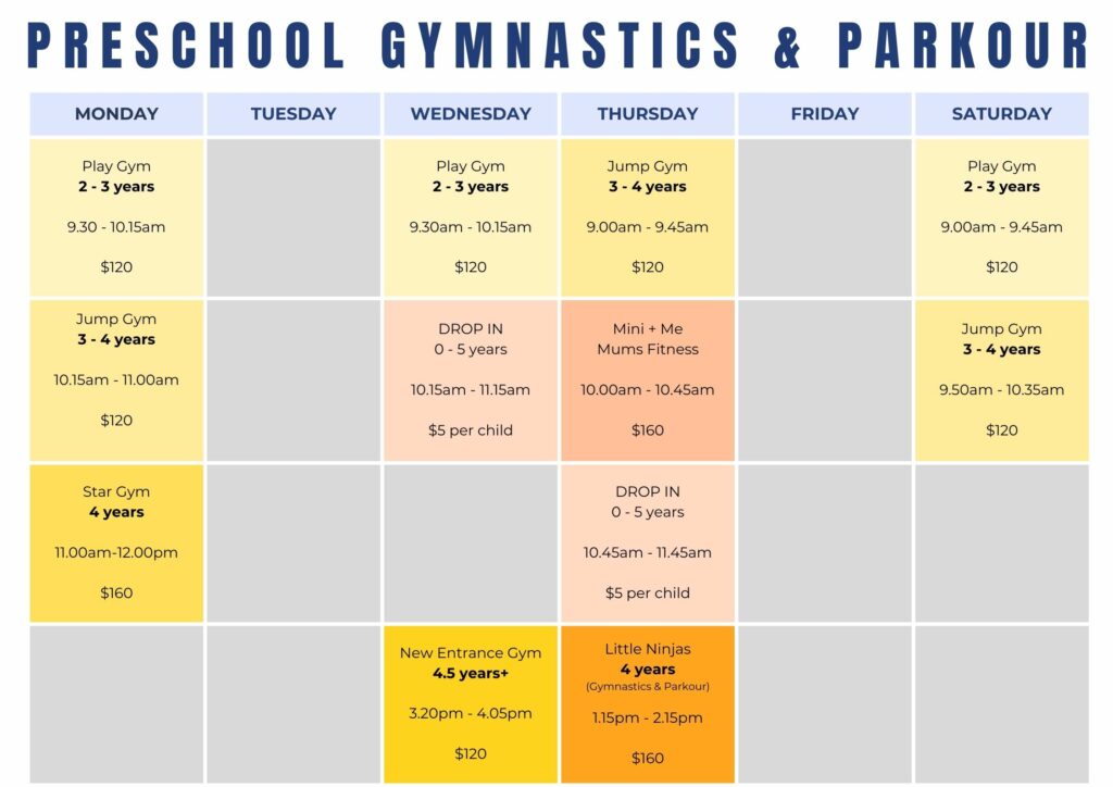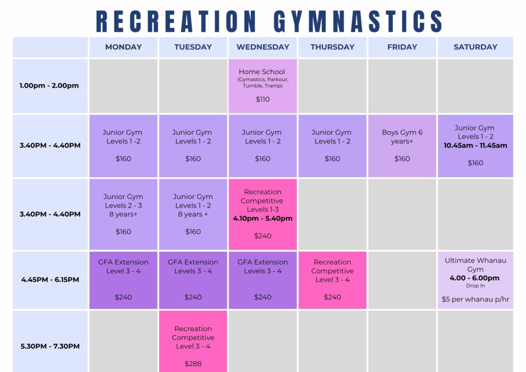 Note: There is a $12 membership fee added to each class price each term – this fee goes straight to Gymnastics New Zealand.